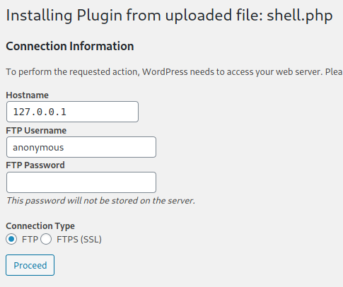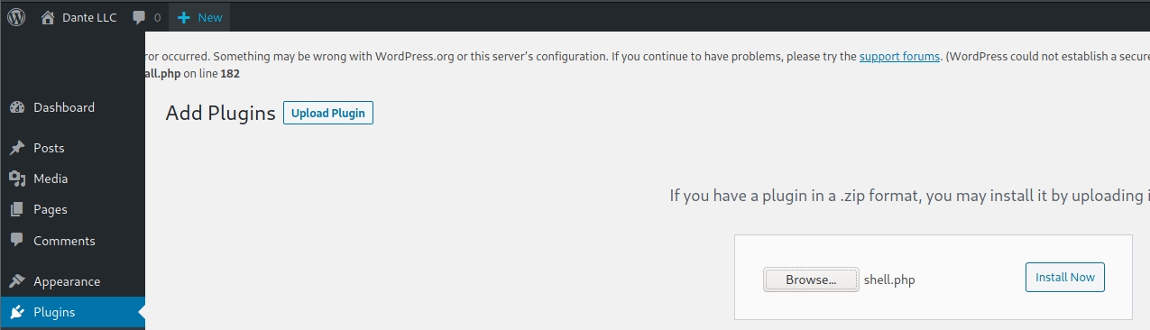 This method involves the installation of a malicious plugin known to be vulnerable and can be exploited to obtain a web shell. This process is carried out through the WordPress dashboard as follows: